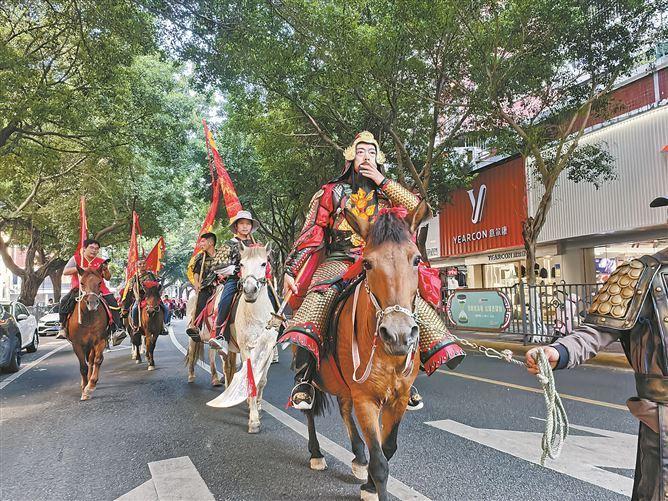 厦门日报讯(记者 林健华 通讯员 余雪燕)身披30公斤重的盔甲,手执长柄大刀,长髯飘飘……马发营扮演的“张府王爷”威风凛凛,目光如炬,身后马队扛旗随行,队伍绵延近千米。
